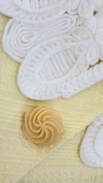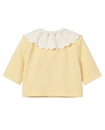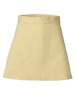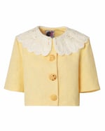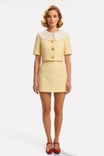 Cotton raised geometric texture tone-on-tone jacquard skirt and jacket with guipure lace collar. The cookie shaped buttons are removable both for safely cleaning purpose as well as giving a versatility to the look. Printed cotton lining.