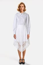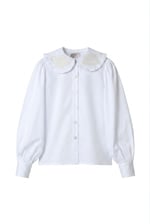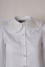 Poplin shirt with flat rounded ruffled collar with embroidered lace appliqués. Decorative buttons.